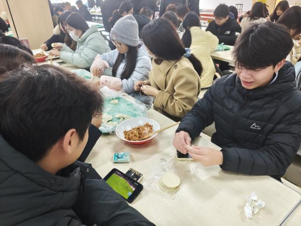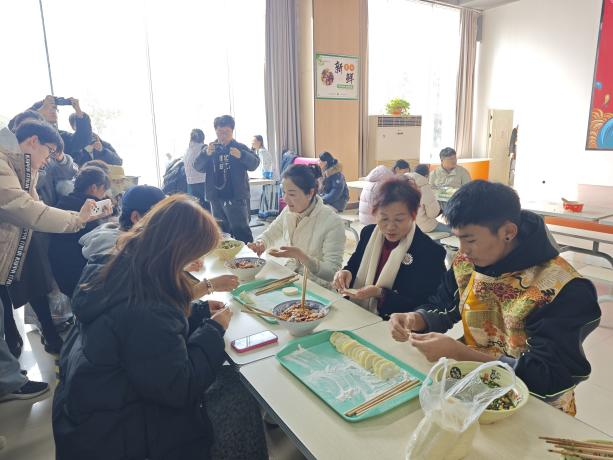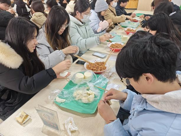 活动现场暖意融融,食堂内摆放着擀好的饺皮、调好的馅料,各类工具一应俱全。师生们围坐在一起,分工协作、默契配合:有的擀皮,有的包馅,有的捏褶,手法各异却都饱含热情。公司领导也参与其中,与同学们亲切交流,手把手指导包饺子的技巧,现场欢声笑语不断,一张张薄薄的饺皮在大家手中变成了形态各异的饺子,满满的幸福感在指尖传递。