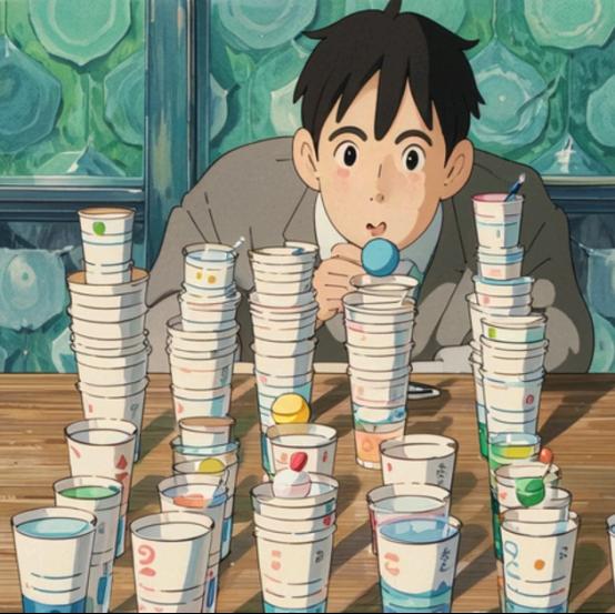 2、桌子上有6只水杯,前5只装满水,第6只装有半杯水,每组一个乒乓球;