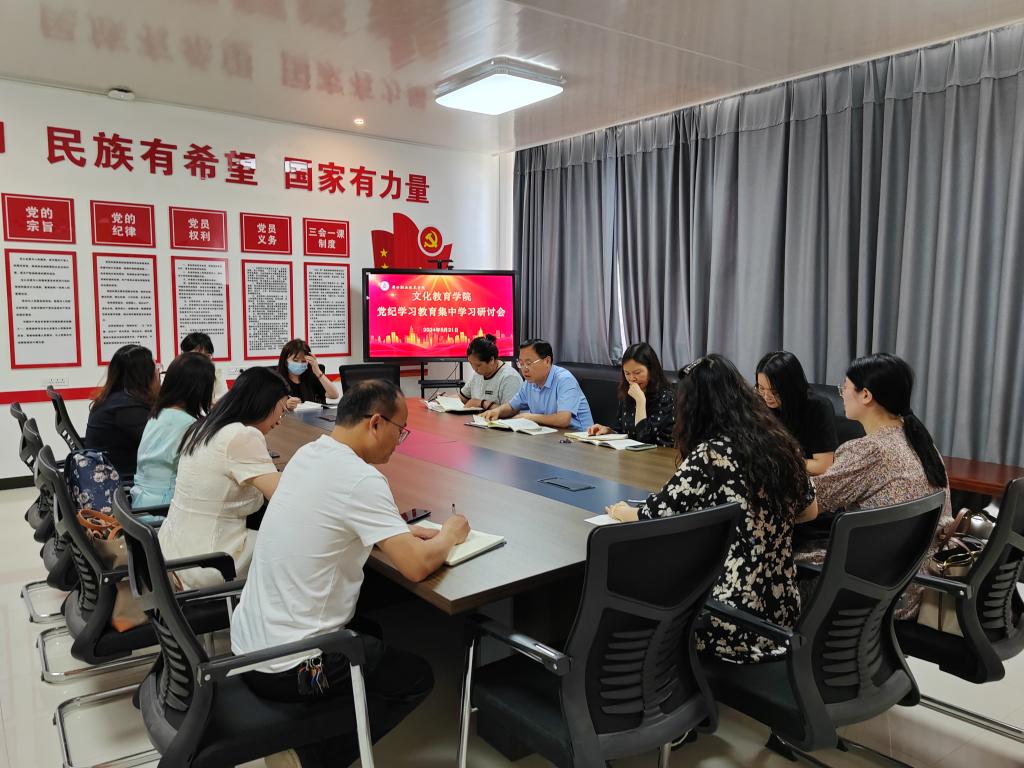 5月21日下午文化教育公司在五区党员活动室召开党纪学习教育集中学习研讨会。公司党总支书记展贤东、经理史丽珍及党总支委员、教师支部委员和员工支部委员参加此次会议。