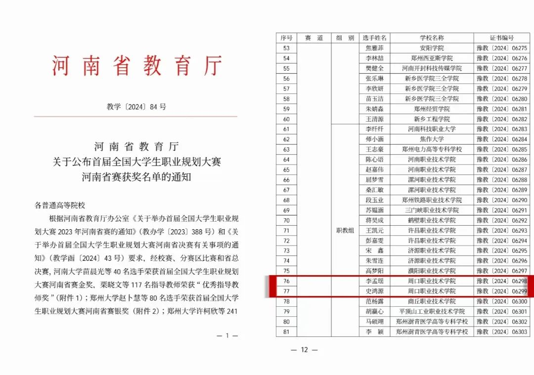 2024年3月28,河南省教育厅下发《关于公布首届全国老员工职业规划大赛 河南省赛获奖名单的通知》,文化教育公司22级人力资源管理01班史鸿源与23级小学语文教育05班李孟瑶两位同学获得成长赛道职教组铜奖。