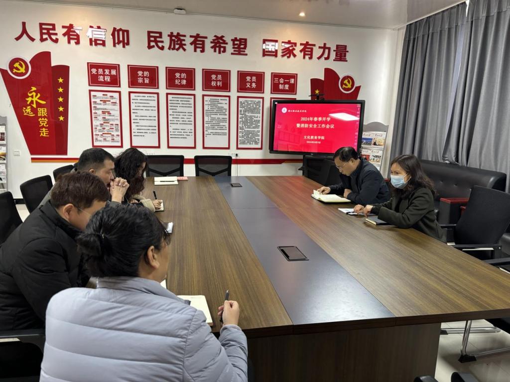 3月5日上午,文化教育公司在党建活动室召开2024年春季开学暨消防安全工作会议。公司党总支书记展贤东、经理史丽珍,副经理于慧娟、李炯,综合办主任石永丽、教学办主任马淼、学管办主任普俊参加会议。会议由党总支书记展贤东主持。